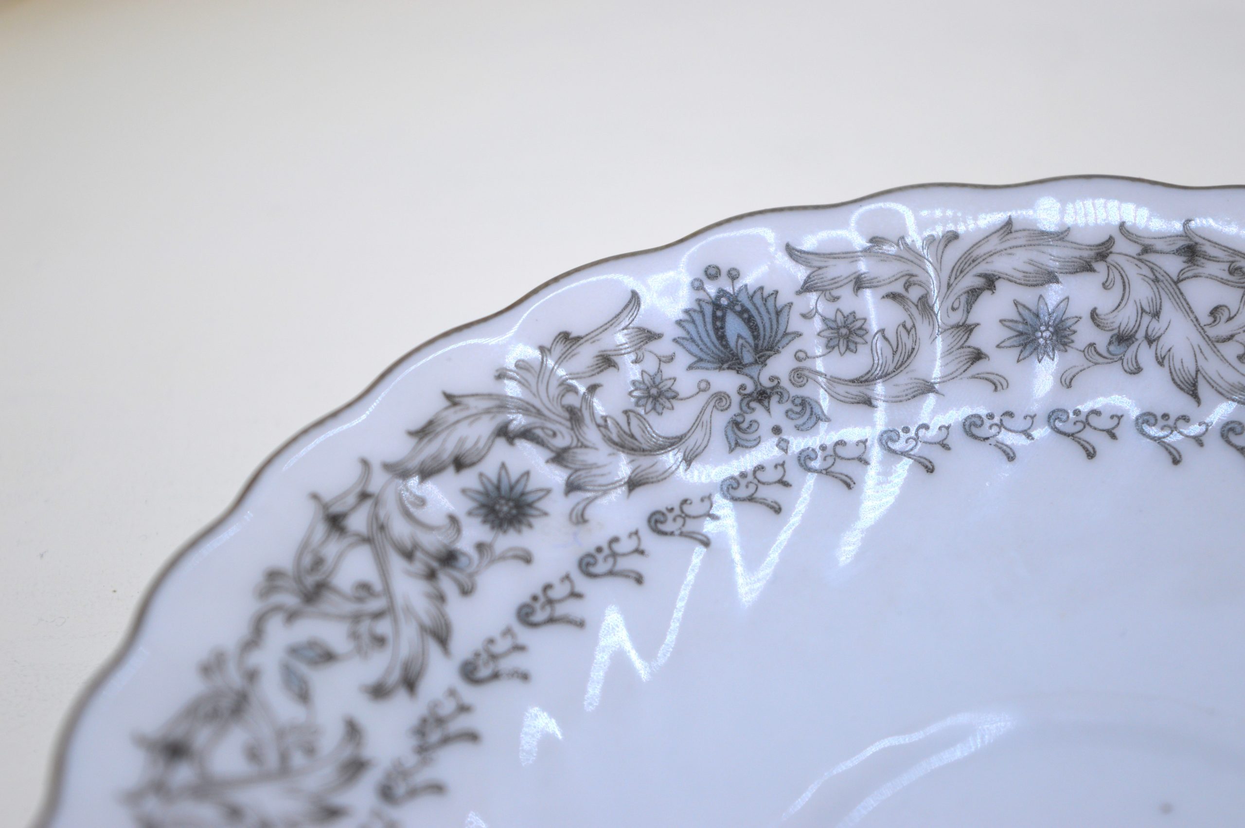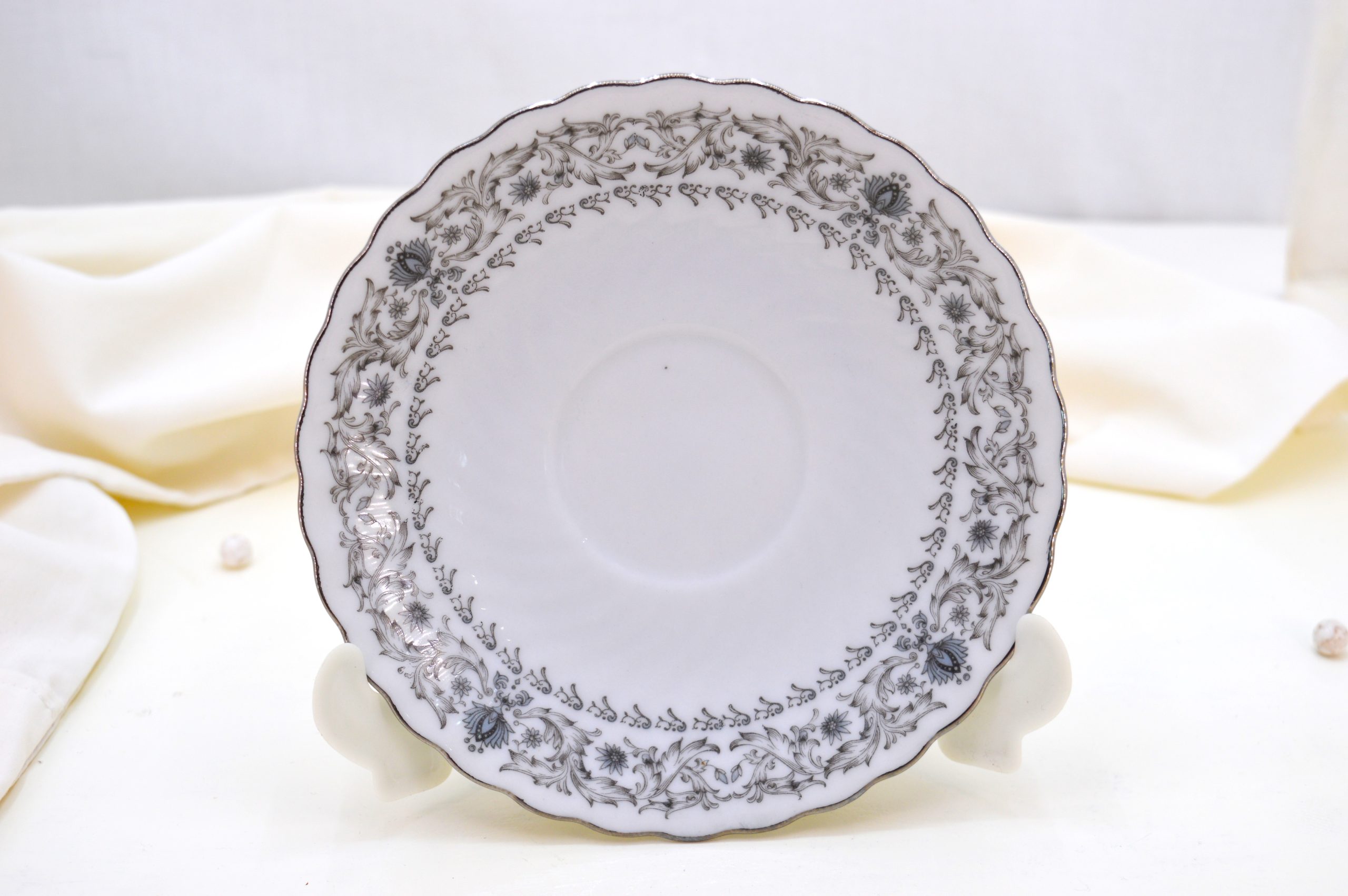 Design: Charcoal Grey antique flowers with silver trim on teacup and saucer.