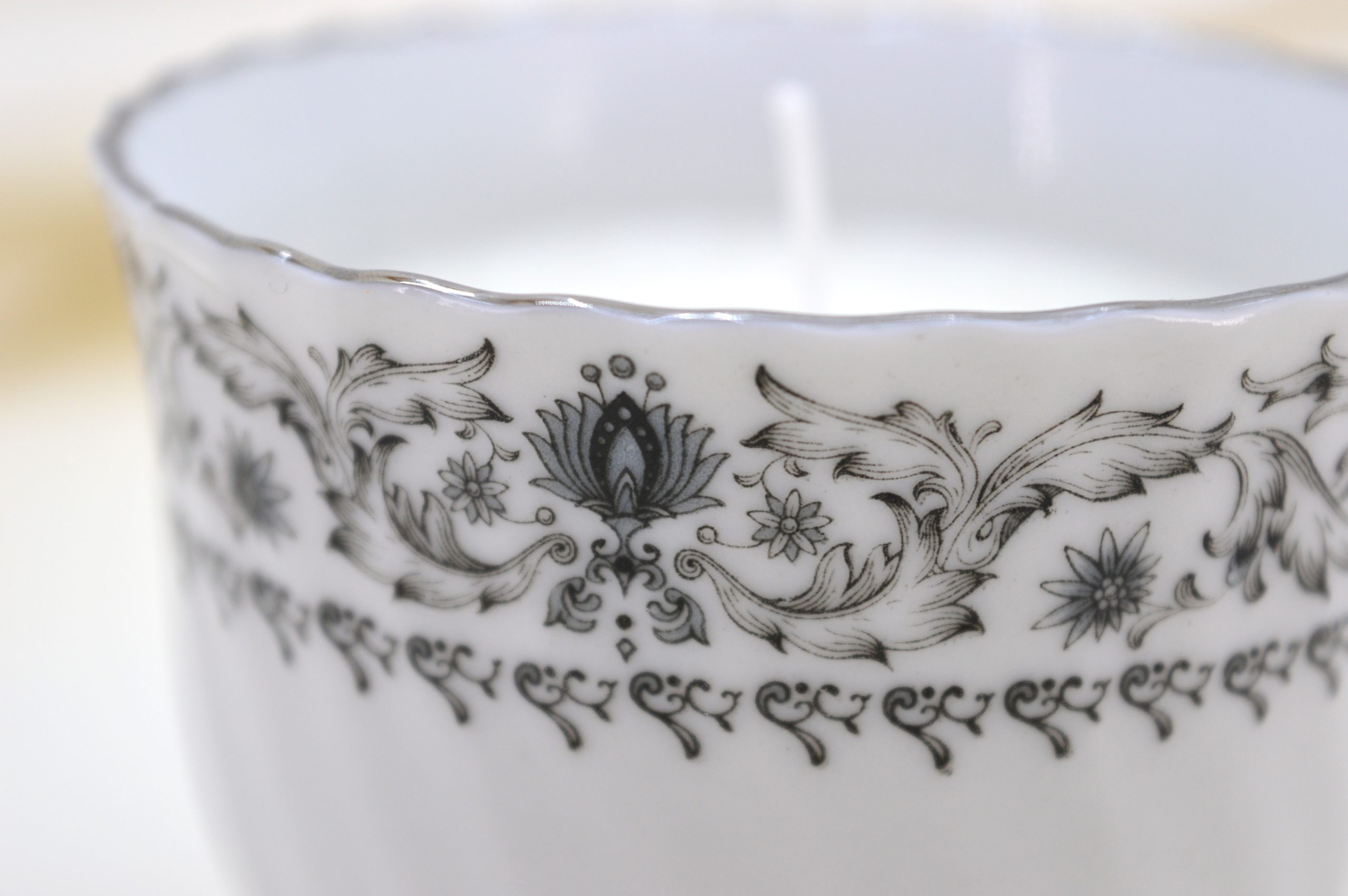 Handmade soy candle, inspired by the silver antique florals. Upcycled matching teacup and saucer set with charcoal grey floral design and silver highlights.