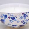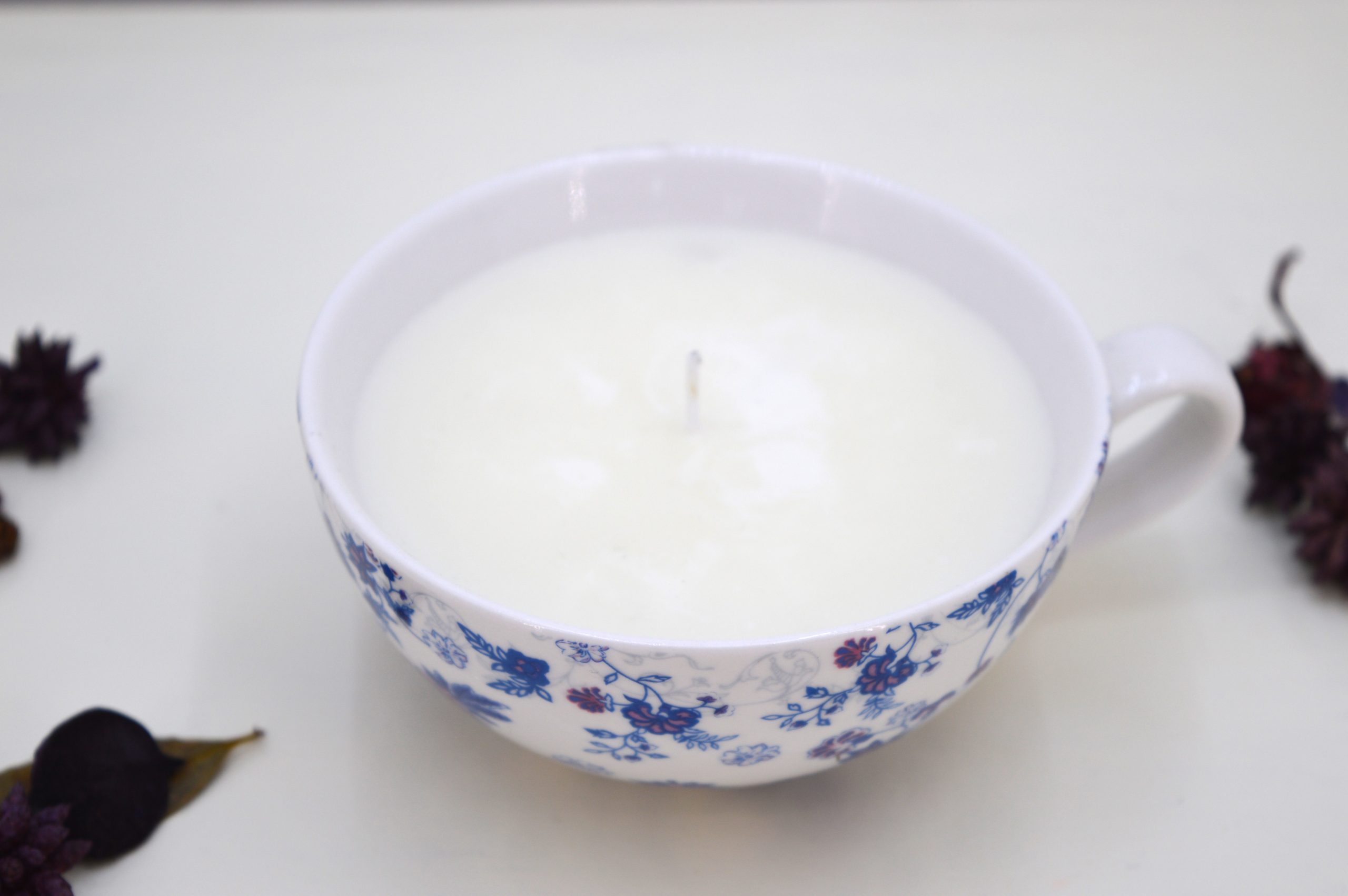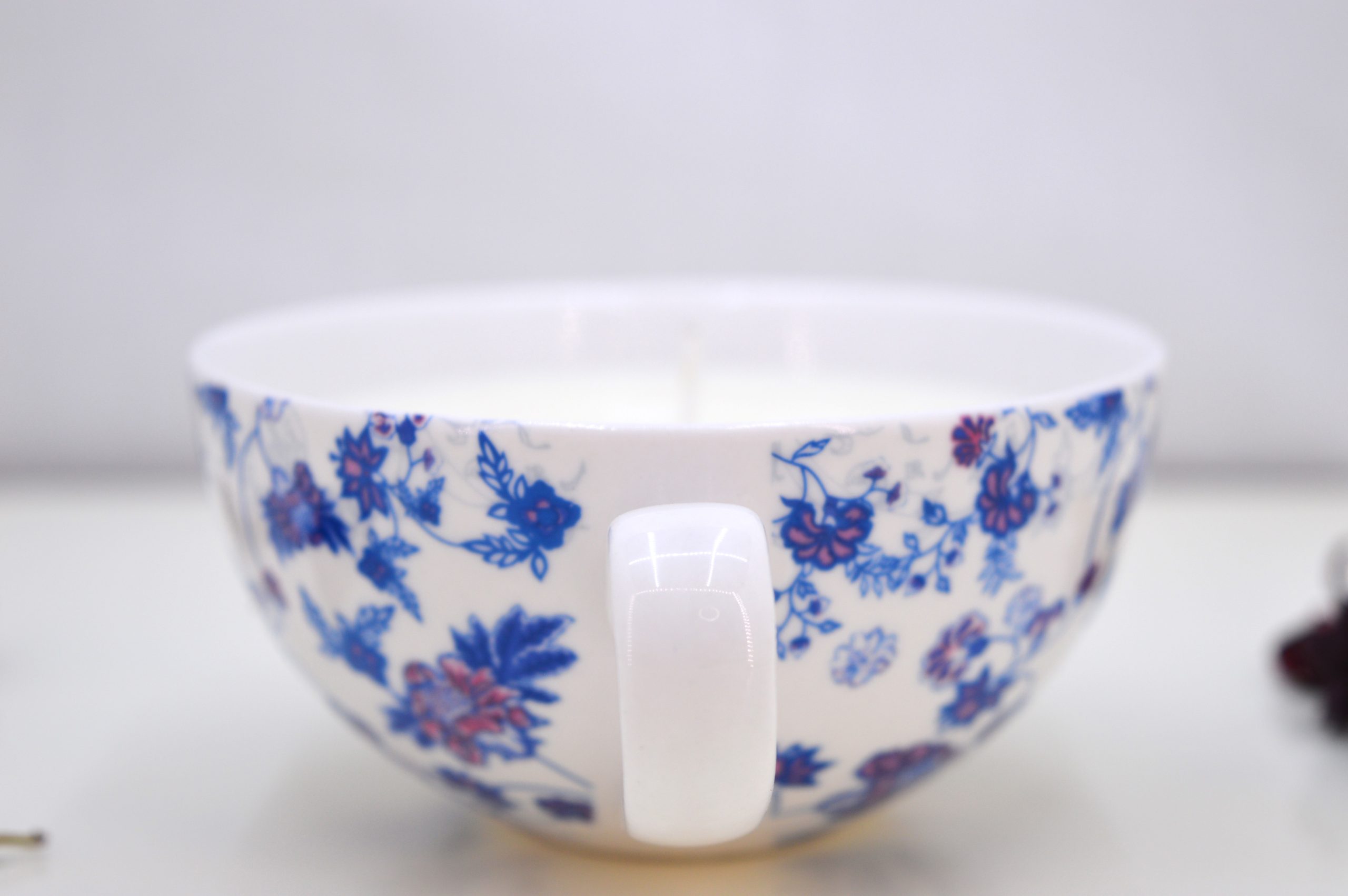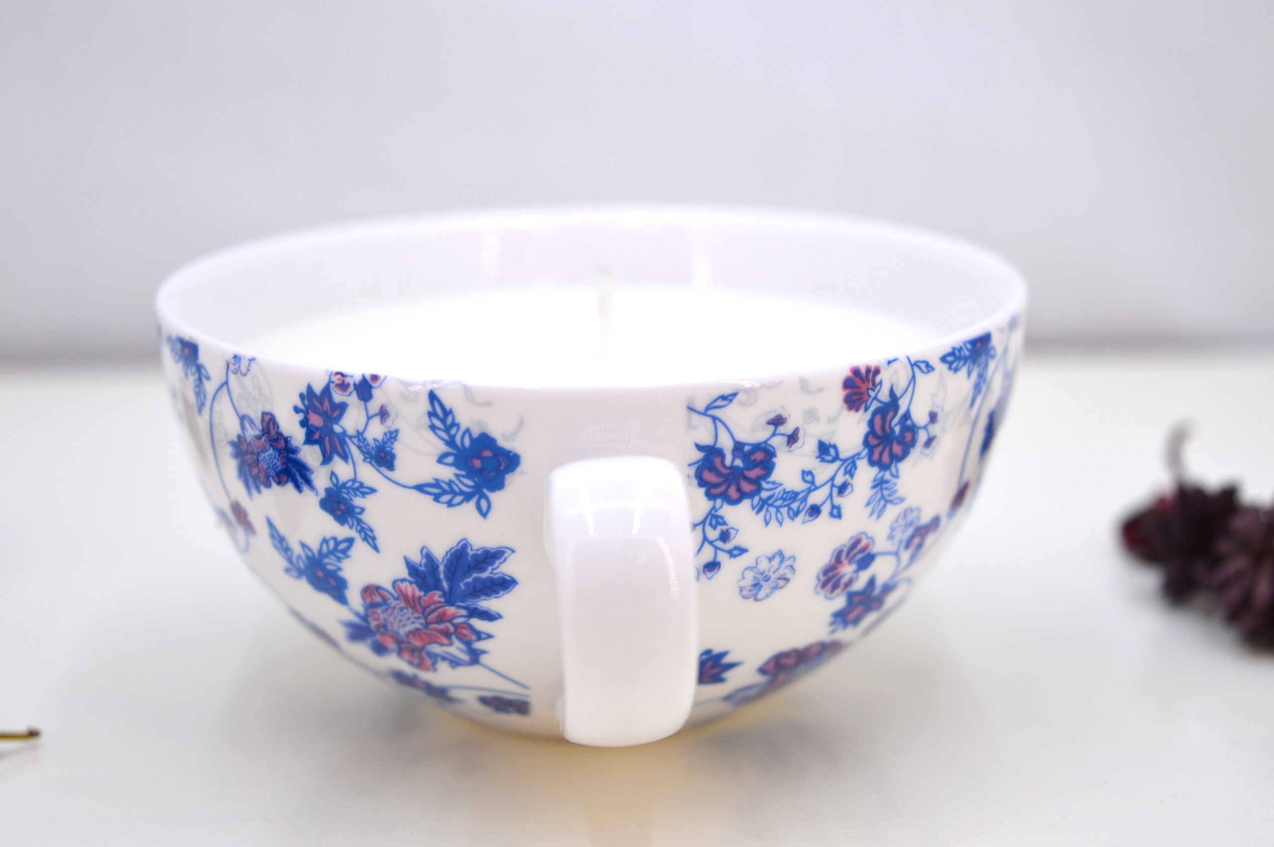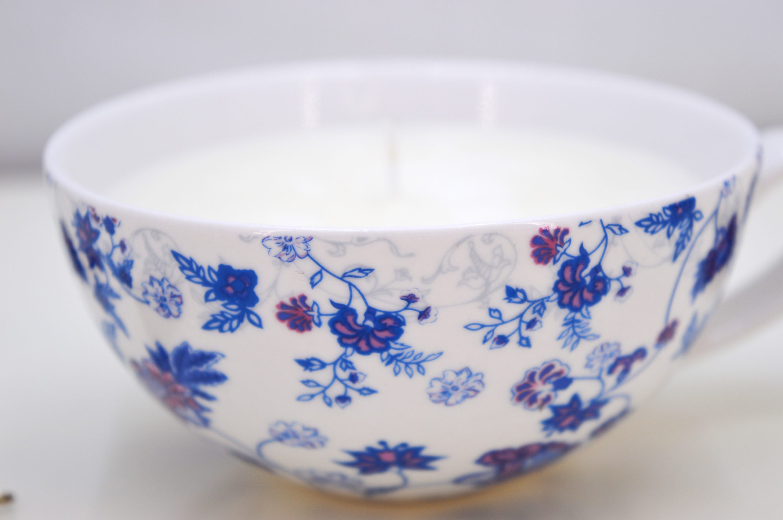Handmade soy candle, inspired by Alice in Wonderland. Upcycled teacup with pink and blue floral design.